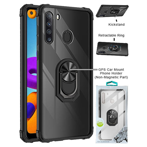 - 360 degrees rotating ring doubles as a ring holder or a kickstand. It can be rotated and swiveled for a hands-free viewing experience. With the integrated metal plate, the strong magnetic car mount makes great contact with your Samsung Galaxy A21 and prevents slipping during bumpy rides.