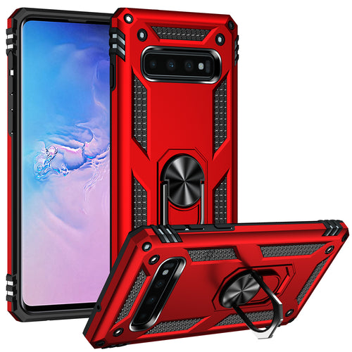 • 360 degrees rotating ring doubles as a ring holder or a kickstand. It can be rotated and swiveled for a hands-free viewing experience. With the integrated metal plate, the strong magnetic car mount makes great contact with your Samsung Galaxy S10 and prevents slipping during bumpy rides.